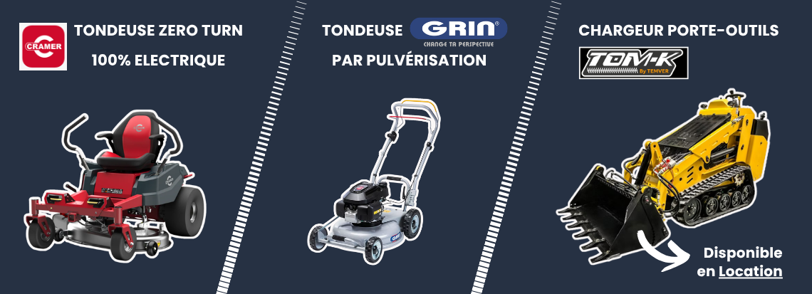 - Large gamme de matériels d’espaces verts (tondeuses, broyeurs, tronçonneuses, etc.), machines à bois, remorques et serres.